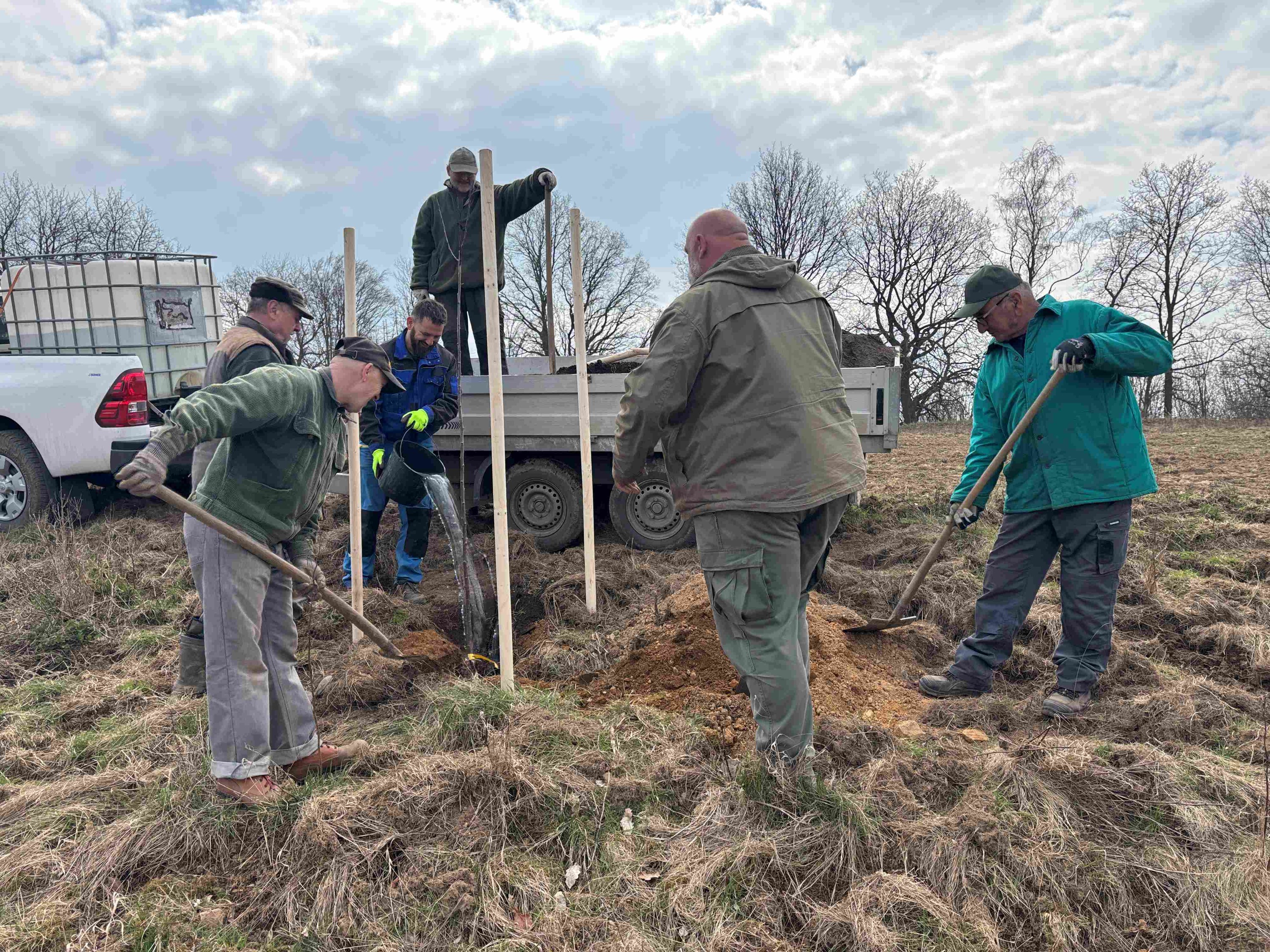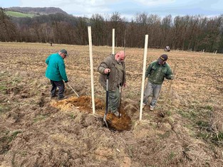 Český Bukov/Povrly - Velikonoční výsadbou nové zeleně se rozhodli uctít svátky Jara členové Mysliveckého spolku Zálesák, jehož honitba se nachází v lokalitě Český Bukov – Povrly. Nepustili se ovšem do zalesnění proluk mezi stávajícími stromy, jak by asi mělo být u nich zvykem, nýbrž do výsadby ovocných stromů podél stávajících remízů, lesopolní cesty i na mezi oddělující dvě pole. Na celkem v různém poměru 120 jabloní, hrušní, slivoní a třešní získal spolek díky grantu Stromy 150 000 korun od Nadace ČEZ. Během Velikého pátku jich vysadili osmdesát, o Bílé sobotě zbývajících čtyřicet.